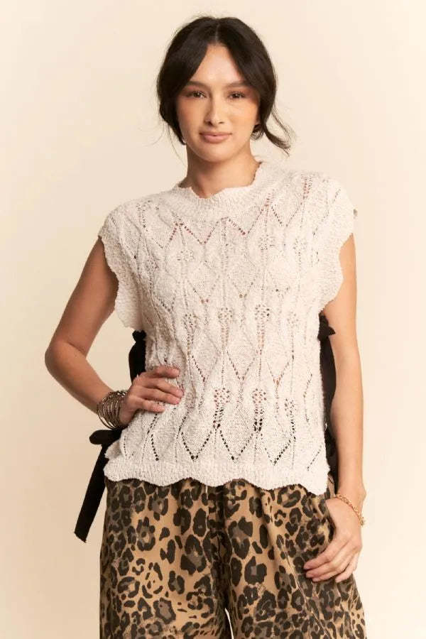 Davi & Dani Ribbon Bow Ties Scalloped Trim Knit Semi Crop Top
