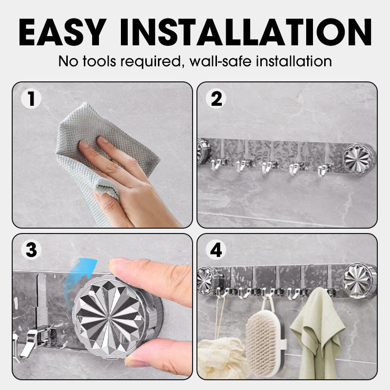 EASY INSTALLATION – Say goodbye to tools. This innovative hook uses a no-drill, press-and-rotate design that adheres to smooth surfaces, offering secure installation—perfect for renters or anyone avoiding permanent wall alterations.