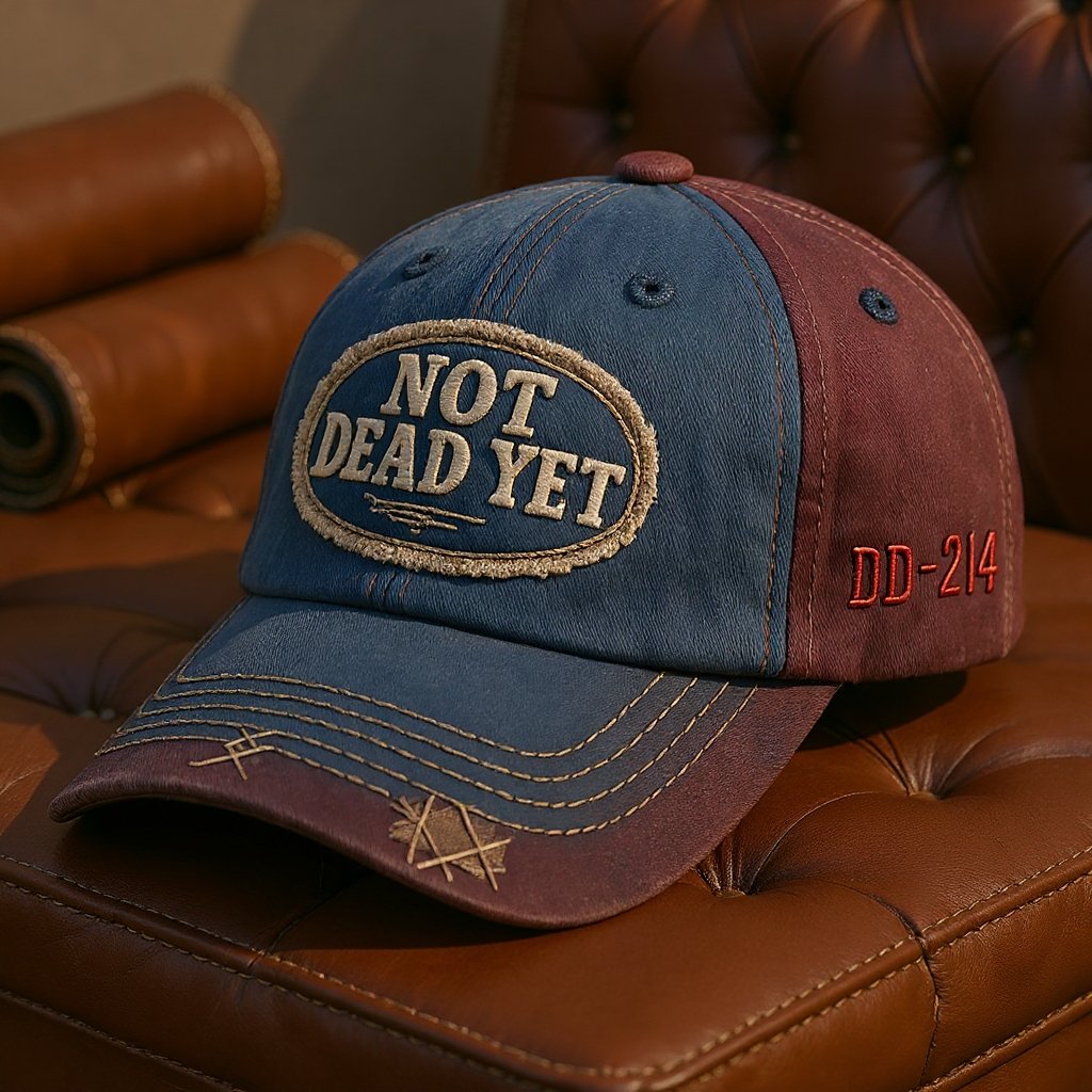 The bold, weathered embroidery declares “NOT DEAD YET”—a simple yet defiant statement of endurance. On the side, a meticulously detailed DD-214 patch adds a layer of authentic military heritage, representing transition, service, and a past that shapes the present. The combination of vintage-toned lettering and symbolic insignia creates a look that’s both personal and powerfully understated.